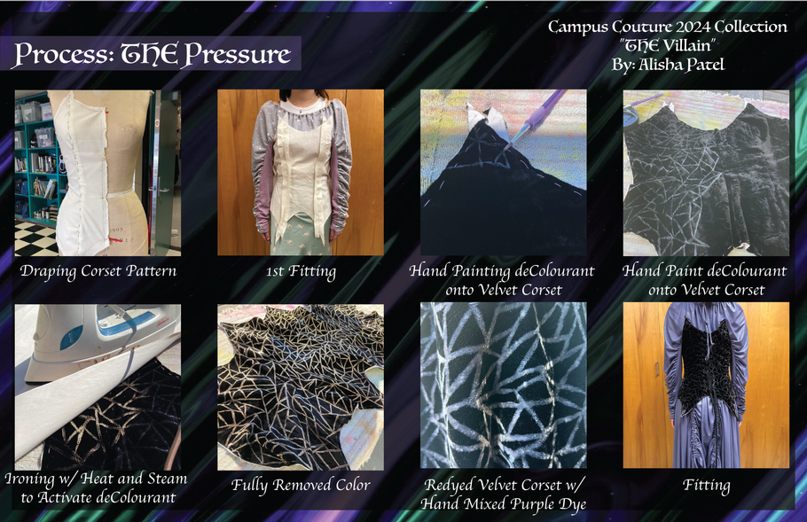 Description: THE Pressure continues the colors of THE Innocent. Using Pattern Magic: Stretch Fabrics by Tomoko Nakamichi for the top part of the underdress, it takes on the illusion of heaviness and weight through the fabric and the gathers of the sleeves. The handkerchief silhouette of the dress has additional drawstrings at all the princess seams to add to the weight and allows for different options of styling. The dress is then accessorized with a pointed corset with the garment adding the feeling of constriction and tightness as another feeling of pressure. This black silk, rayon velvet corset has been hand deColourant/bleached out with a geometric tangle of lines, which were then redyed to match the purple of the dress. This pattern starts to show the internal mental struggle and chaos.